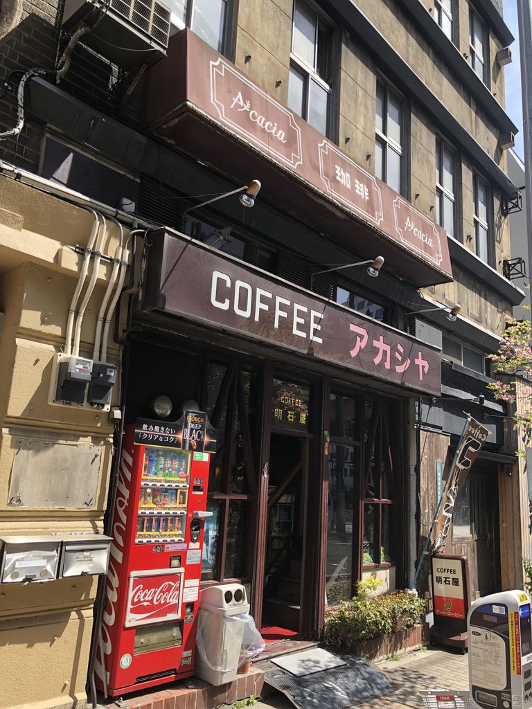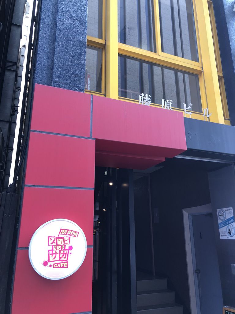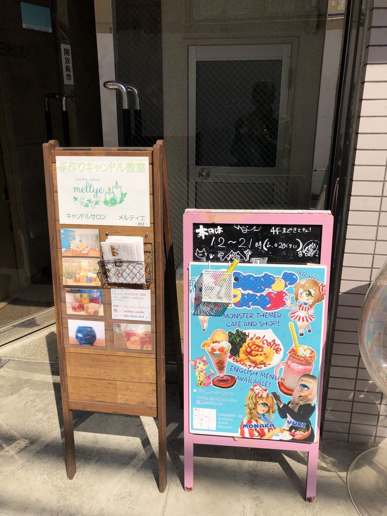 黄色いビルの隣りにある小さなビルで、タテカンが