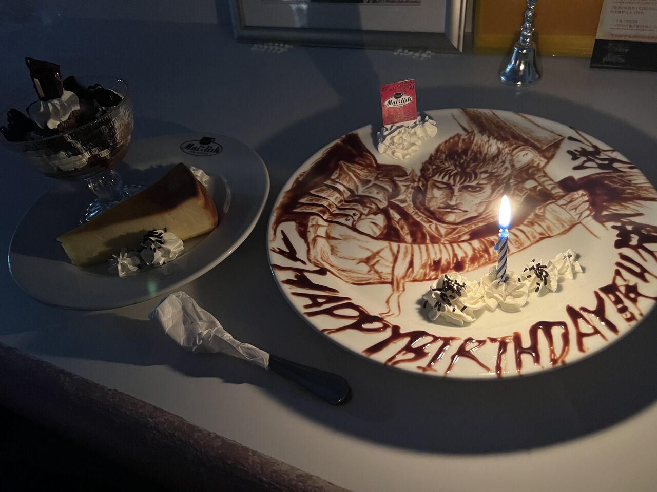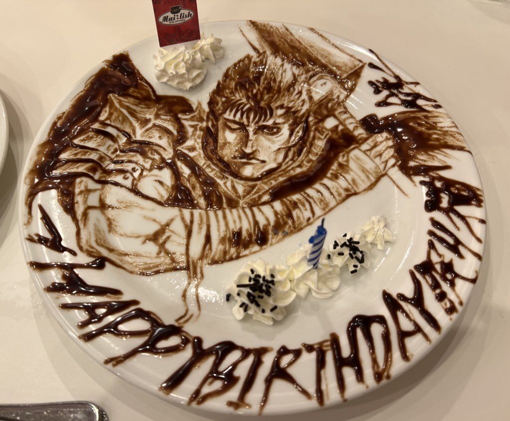プレートの生クリームは食べたが、チョコレートはガッツの絵には目があってしまってとても食べるのがもったいなくてそのままにした。
